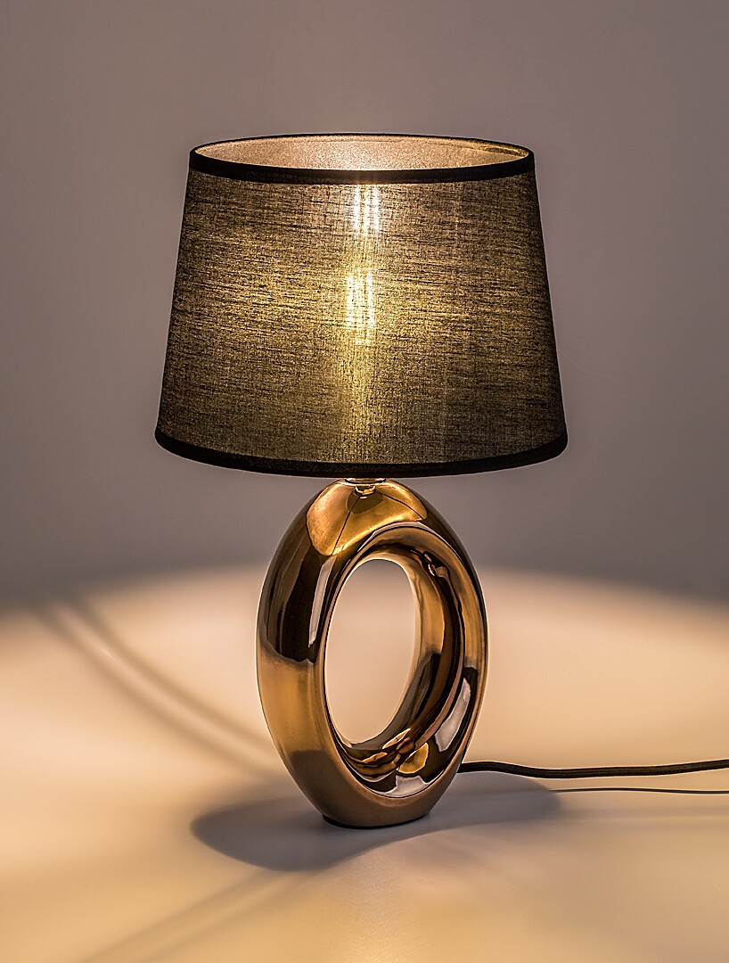 Stolní lampa Rabalux Dalora je doporučena těm, kteří mají rádi moderní svítidla s jedinečným designem. Tento výrazný model lze umístit do ložnice nebo obývacího pokoje. Má oválné tělo s otvorem uprostřed, vyrobené z keramiky v bronzové barvě. Stínidlo je černé, válcovitého tvaru, směrem dolů se mírně rozšiřuje a je vyrobeno z textilu. Světlo lze ovládat pomocí jedné žárovky s maximálním příkonem 25 W. Typ objímky je E14. Můžete si zvolit světelný zdroj s teplým nebo přirozeným bílým světlem. Díky tmavému stínidlu lampa poskytuje diskrétní osvětlení, takže je ideální volbou, pokud nechcete v noci rušit partnera ostrým světlem. Noční lampa je vybavena černým textilním kabelem a spínačem na kabelu. Dodává se bez světelného zdroje.