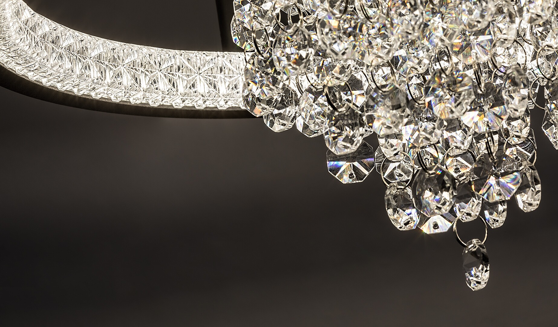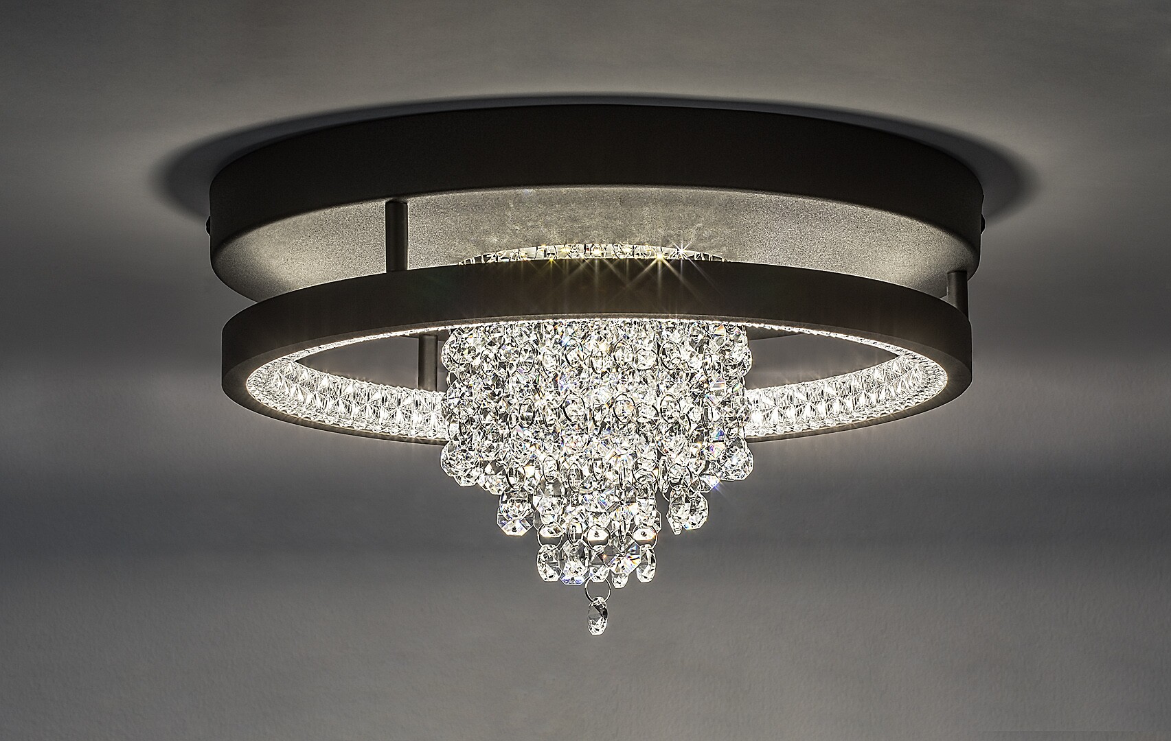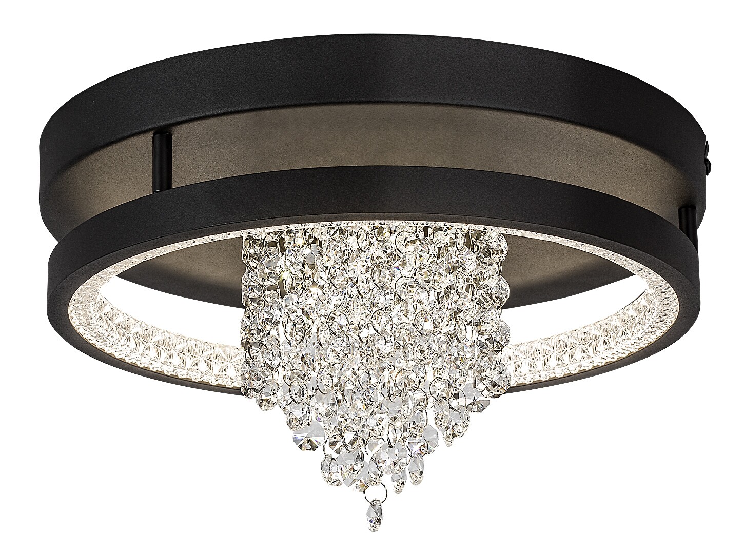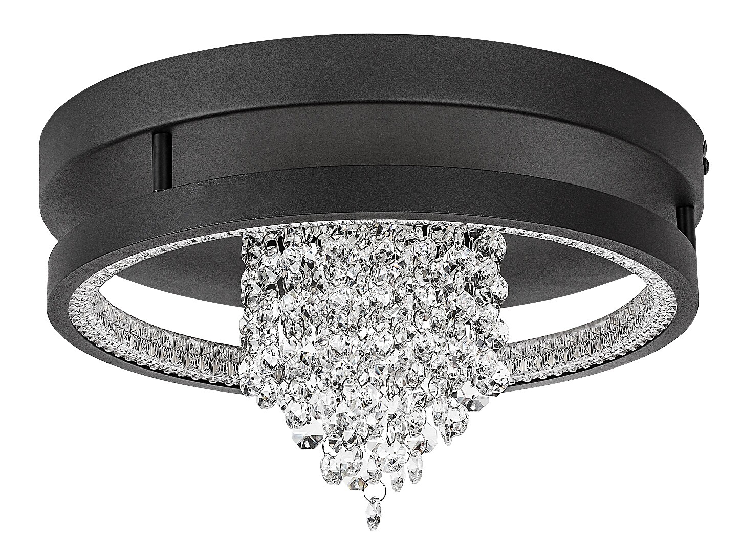 Stropní svítidlo Rabalux Maribell je doporučeno těm, kteří hledají LED svítidlo s efektem lustru, ale zároveň s moderním vzhledem. Tento elegantní, třpytivý model je ideální do obývacího pokoje, jídelny nebo ložnice. Konstrukce má kulatý tvar, je černé barvy, vyrobená z kovu a doplněná stínidlem z průhledného skleněného křišťálu. Stínidlo obíhá po vnitřním okraji lampy a uprostřed visí svazek křišťálových závěsů. Tento krásný lustr má vestavěný LED světelný zdroj s přepínačem DIP pro nastavení teploty barev ve třech variantách: můžete si vybrat teplé nebo přirozené bílé světlo. LED technologie zajišťuje stropnímu svítidlu energeticky úsporný provoz a dlouhou životnost.