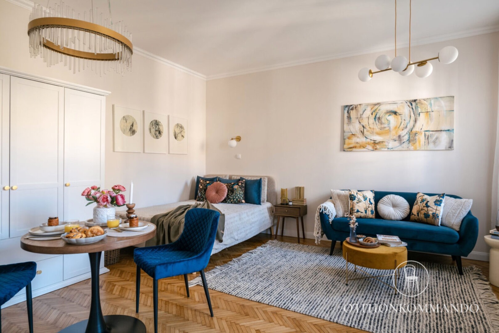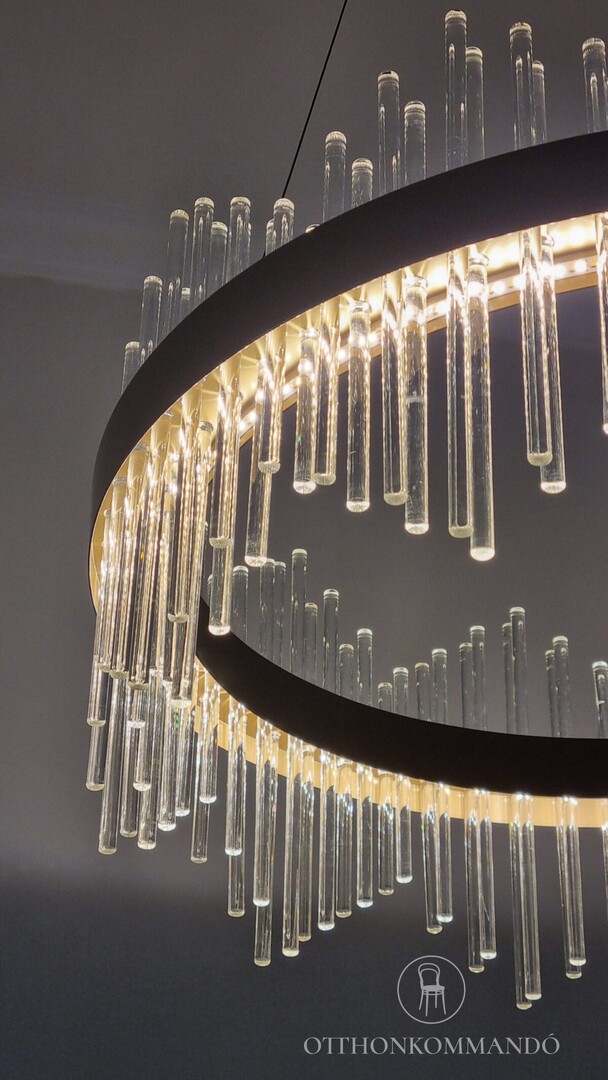 Inteligentní závěsné svítidlo Mabel v klasickém stylu nabízí efektní řešení osvětlení do obývacího pokoje nebo ložnice. Doporučujeme jej především těm, kteří upřednostňují ozdobnější, poutavá stropní svítidla a hledají model s vysokou svítivostí. Zlatou kovovou lampu doplňuje průhledné skleněné stínítko a na strop lze připevnit pomocí kulatého ozdobného podstavce. Třpytivý závěs se skládá z prstencového prvku zlaté barvy a válcovitých prvků, které z něj vycházejí nahoru a dolů a připomínají třpytivé rampouchy. Svítilna Mabel má zabudovaný LED světelný zdroj s energetickou třídou G, výkonem 36 W, svítivostí 2480 lumenů se stínítkem, 2700 lumenů bez stínítka a s životností 36 000 hodin. Teplotu barvy světelného zdroje lze měnit pomocí nástěnného vypínače: světlo můžete nastavit na 3000, 4000 nebo 6000 K, t. j. teplé, přirozené nebo studené bílé světlo. Rozměry inteligentního závěsného svítidla jsou tyto: průměr 580 mm, instalační průměr 200 mm, nastavitelný převis svítidla je v rozmezí 500-1000 mm.