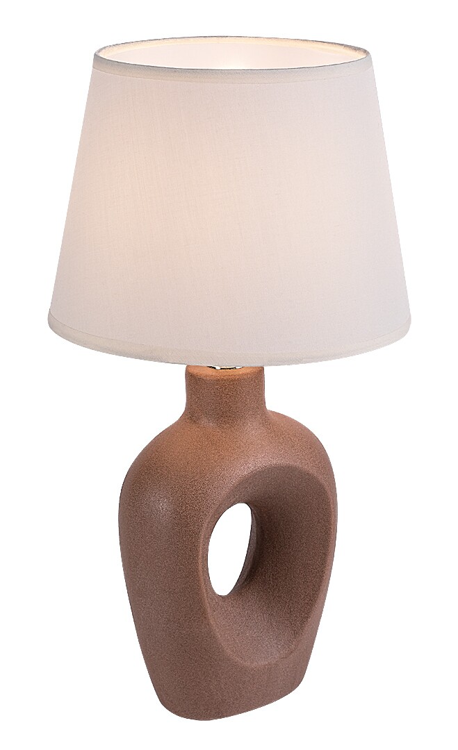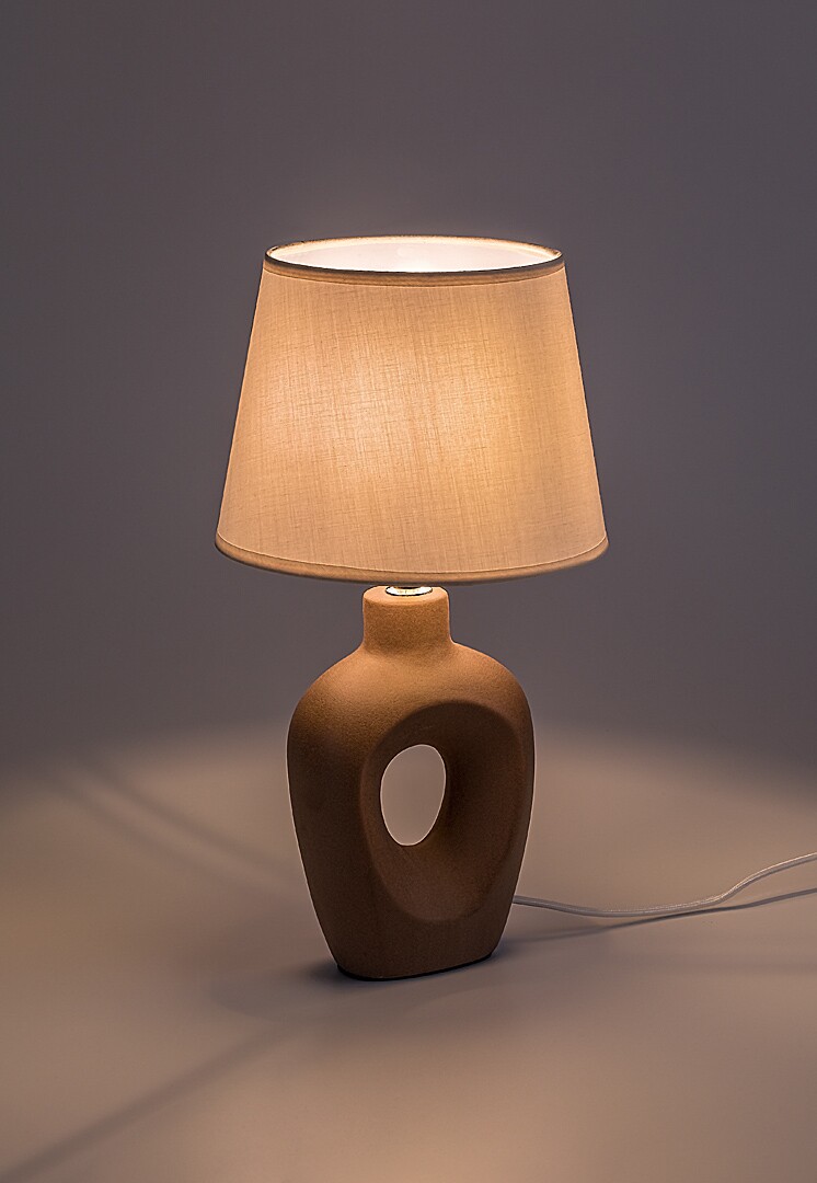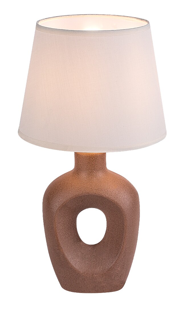 Stolní lampa Rabalux Madelor je doporučena těm, kteří hledají moderní doplňkové svítidlo s jedinečným designem do obývacího pokoje nebo ložnice. Noční lampička je vyrobena z hnědé keramiky a zaujme výrazným tvarem s otvorem uprostřed. Stínítko má tvar písmene A, směrem dolů se mírně rozšiřuje a je vyrobeno z béžové textilie, která ladí se základnou lampy. Stolní lampu lze provozovat s jednou žárovkou o výkonu maximálně 25 W. Patice žárovky je typu E14. Pokud ji umístíte do ložnice, je vhodné použít žárovku vyzařující teplé bílé světlo, které pomáhá relaxaci. Můžete ji umístit na noční stolek nebo jakýkoliv jiný stůl. Lampička je vybavena bílým textilním kabelem a vypínačem umístěným na kabelu. Dodává se bez světelného zdroje.